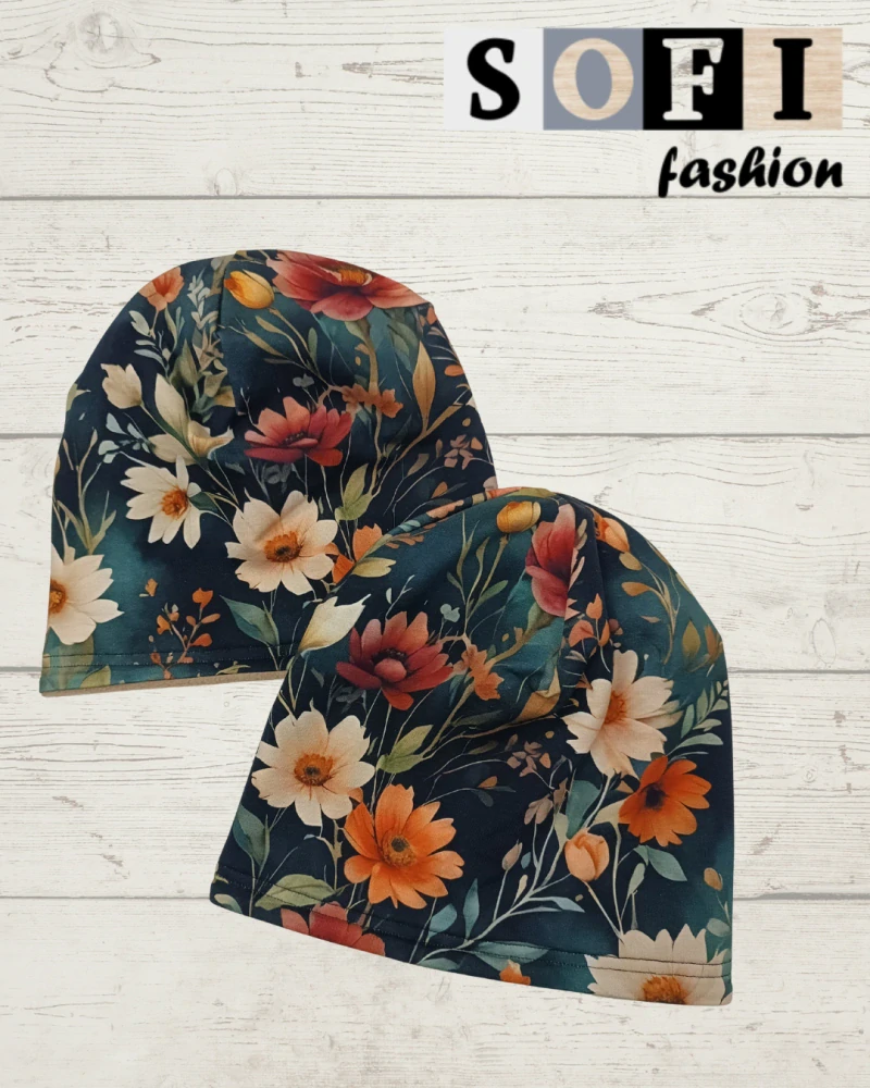 Čepice dvouvrstvá - barevné květy na tmavéSkladem 4 ks250 Kč/ ks