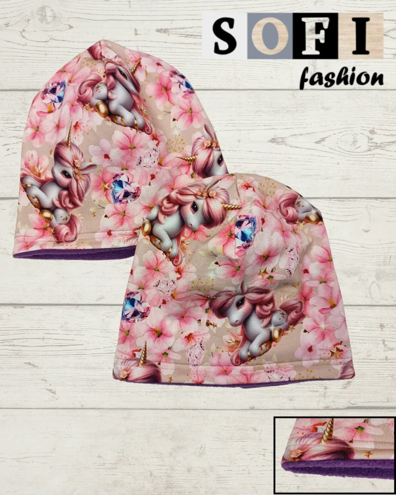 Čepice dvouvrstvá - jednorožec, květy - fialový fleeceSkladem 1 ks250 Kč/ ks