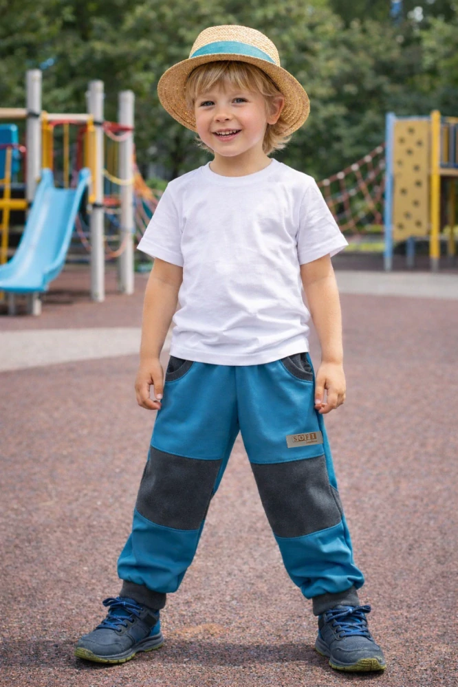 Praktické letní softshellové kalhoty, které maminkám usnadní oblékání dětí na hřiště, do školky i na výlety. Jsou lehké, pružné a odolné, takže děti mohou běhat, lézt i sedět v trávě, aniž by je kalhoty omezovaly nebo hned promokly.