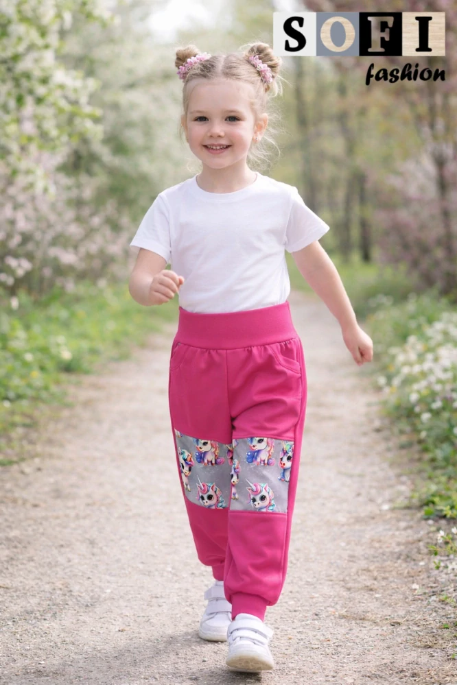 3. Letní dětské softshellové kalhoty - růžové/jednorožci na šedé