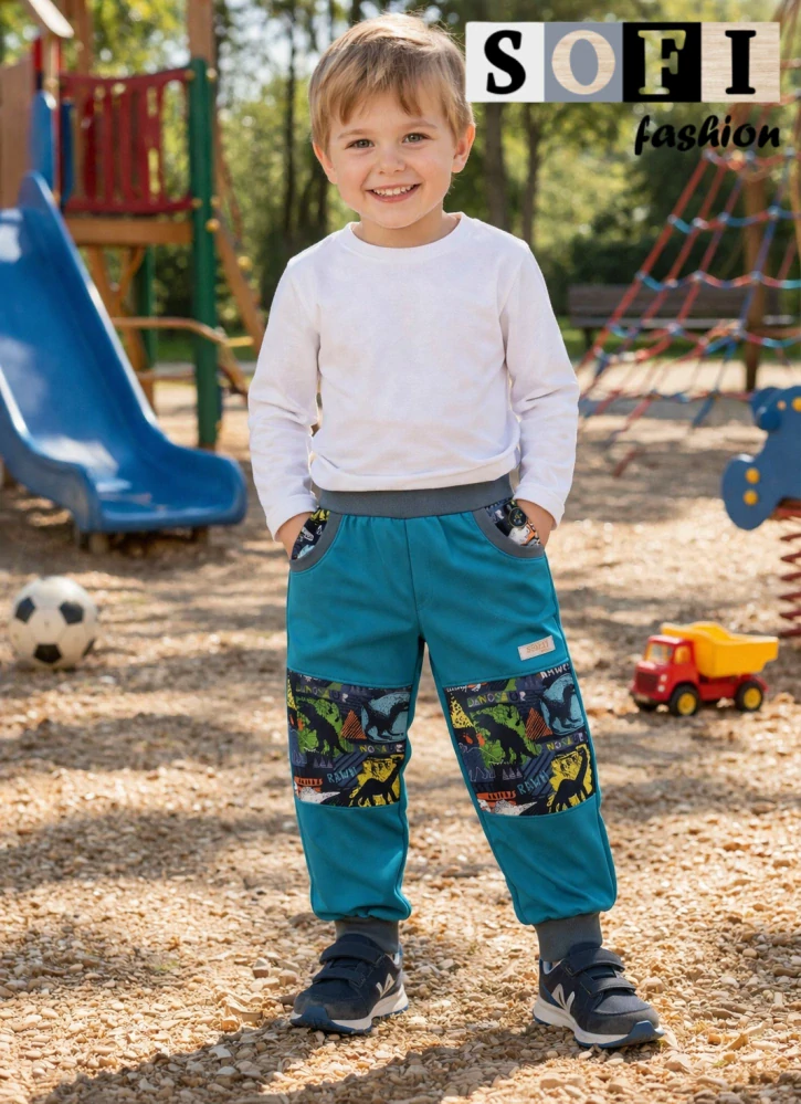 3. Letní dětské softshellové kalhoty - tyrkys/dino