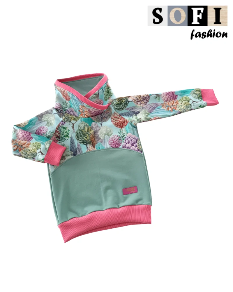Tato jedinečná mikina od Sofi Fashion CZ je dokonalou kombinací jemnosti, originality a pohodlí. Základ mikiny tvoří nádherná tlumená mentolově–zelená barva, která působí klidně, čistě a luxusně. Horní část, rukávy a límeček zdobí bohatý květinový vzor v tónech růžové, fialové, krémové, zelené i tyrkysové – jako malovaná zahrada plná fantazie 🌸🌿.