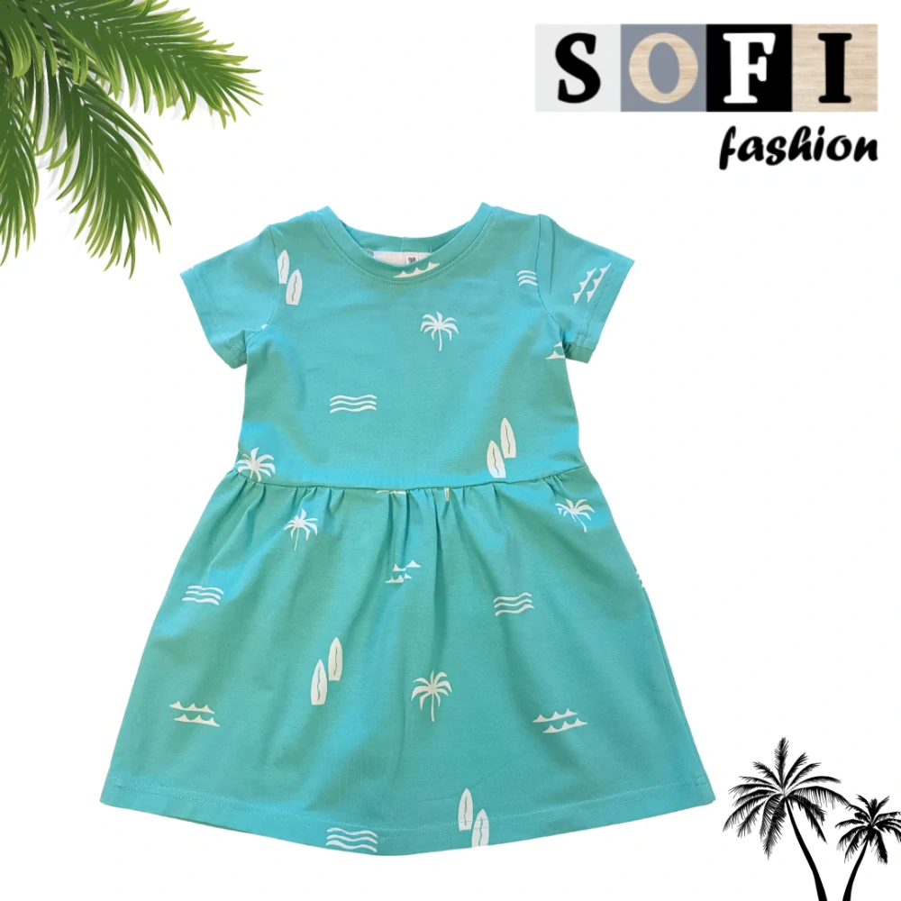 Rozkošné letní šaty 🌴 "Surf and smile"🌴 v tyrkysové barvě s potiskem palem, vln a surfařských prken – ideální volba pro malé dobrodružnice milující slunce, moře a letní pohodu. Díky měkkému a prodyšnému materiálu se skvěle hodí na horké dny u vody i na plážové procházky pod palmami. Praktický střih umožňuje volnost pohybu, ať už při hraní na písku nebo objevování světa kolem. Sofi Fashion přináší styl, který si děti zamilují