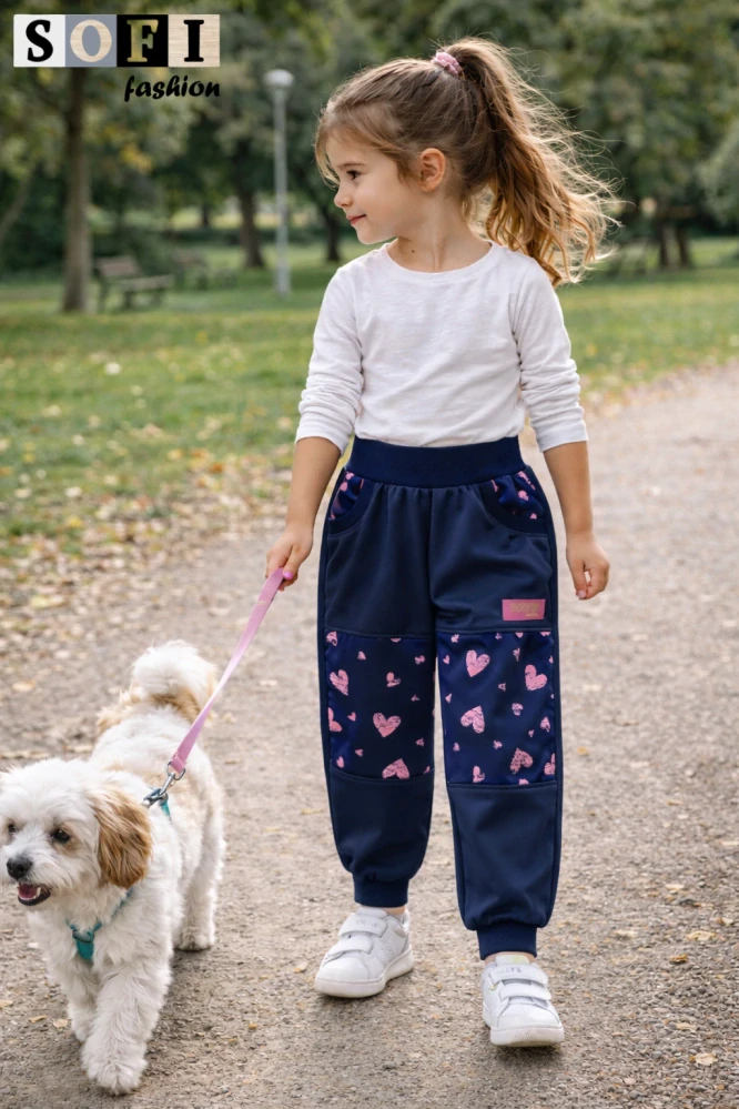 Softshelové letní kalhoty - tmavě modré s růžovými srdíčky