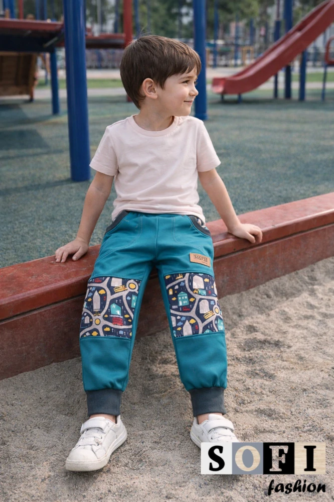 Softshelové letní kalhoty - tyrkysové se silnicemi a auty, doplněné šedým nápletem