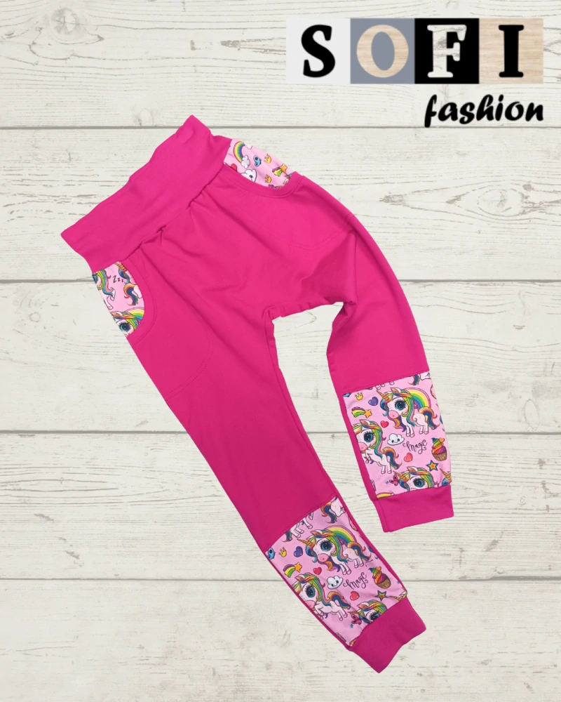 Tepláky baggy s kapsami - jednorožci/tmavší růžová