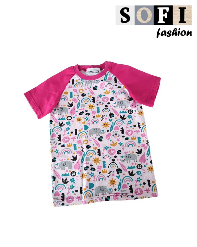 Tričko s kr. rukávem slon na sv. růžové, rukávy růžovéSkladem 1 ks350 Kč/ ks